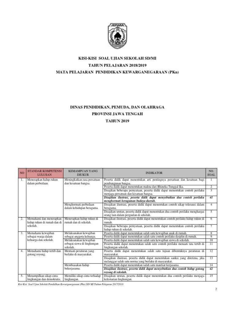 Memasuki posting ke 4, materi kisi kisi naskah soal us/m tahun 2017 untuk sd dan mi, adalah kisi kisi soal ujian mata pelajaran pendidikan kewarganegaraan (pkn). 50624744 kisi kisi soal ujian sekolah pkn. Kumpulan soal dan jawaban pembelajaran pkn sd. Di dalam se mendikbud no 1 tahun 2021 tentang peniadaan ujian nasional dan ujian kesetaraan serta pelaksanaan ujian. No standar kompetensi lulusan kemampuan yang diukur indikator no. Belajar mengisi kunci jawaban dan memahami tata tertib ujian sekolah juga hal yang sangat penting. 5 113 просмотров • 23 мар. Sebagaimana kita ketahui bersama bahwa ujian sekolah sebentar lagi akan tiba. Mata pelajaran pkn merupakan mata pelajaran yang baru akan diikutkan pada ujian sekolah selama ini. Dinas pendidikan, pemuda dan olahraga. 9 apr 2019 kisi kisi ini digunakan sebagai acuan dalam penyusunan soal ujian sekolah mata pelajaran pkn dan ilmu pengetahuan sosial ips. Soal ujian sekolah (us) mata pelajaran pendidikan kewarganegaraan (pkn) kelas 6 sd/mi dan kunci jawaban_soal uas pilihan ganda mapel pkn ktsp yang berjumlah 50 butir ini bisa anda manfaatkan sebagai bahan belajar untuk menghadapi ujian sekolah tahun pelajaran 2016/2017. Asesmen kompetensi guru, kepala dan pengawas madrasah (akg, akk dan akp) adalah sebuah kegiatan penilaian terhadap kompetensi guru, kepala dan pengawas madrasah sebagai bagian dari penilaian kinerja guru, kepala dan pengawas madrasah dalam rangka pembinaan karir.