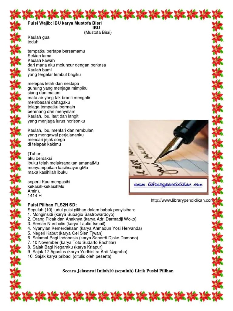 Ada dua judul puisi yang akan ditampilkan oleh hesti, yaitu puisi wajib yang berjudul "sajak buat negaraku" karya kriapur dan puisi pilihan . Puisi sajak buat negaraku dan kepada ibuku oleh maria dorothy. Sajak bagi negaraku (karya kriapur) . Menuai di setiap sudut kota negaraku. Download lagu sajak tafsir karya sapardi djoko damono mp3 .